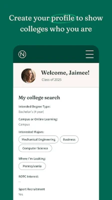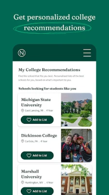 • Personalized recommendations: Once you start using the app, we’ll create customized lists of colleges that might be a good fit for you based on your specific priorities and interests.