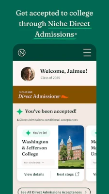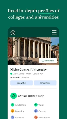 On the Niche app, you have access to comprehensive profiles on every college in America — from the ones you already know about to the ones you have yet to discover. You can use Niche to read student and alumni reviews, browse our personalized college recommendations, apply for scholarships and more.